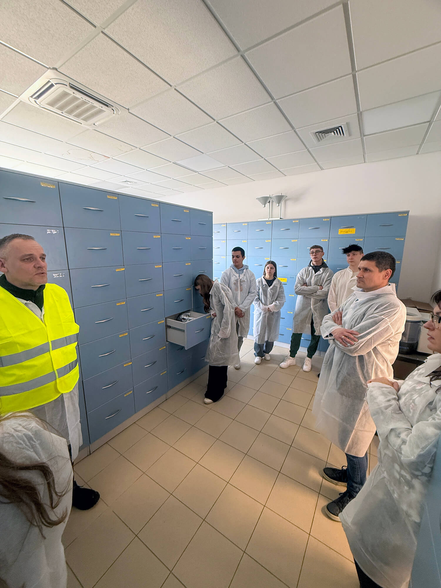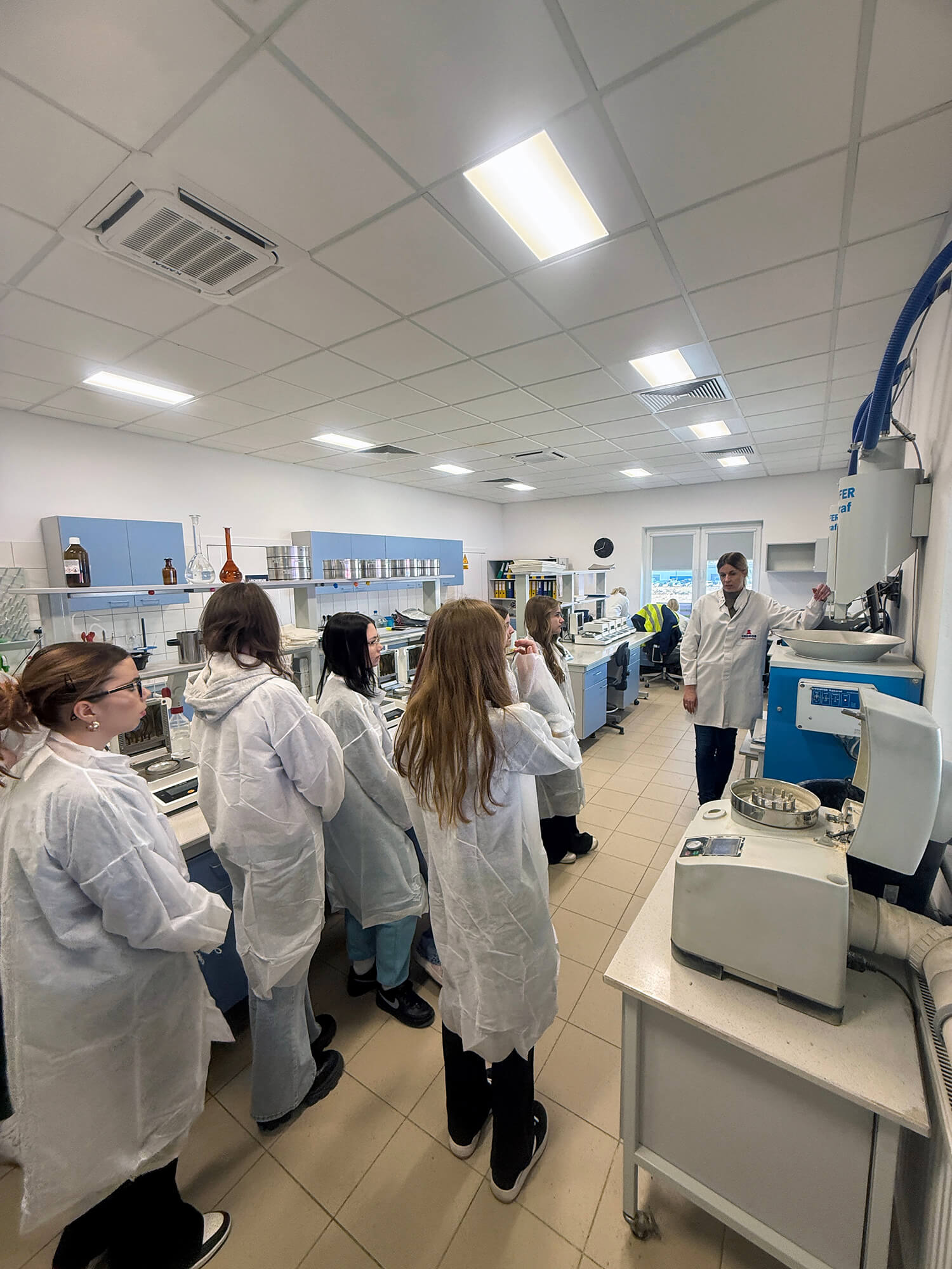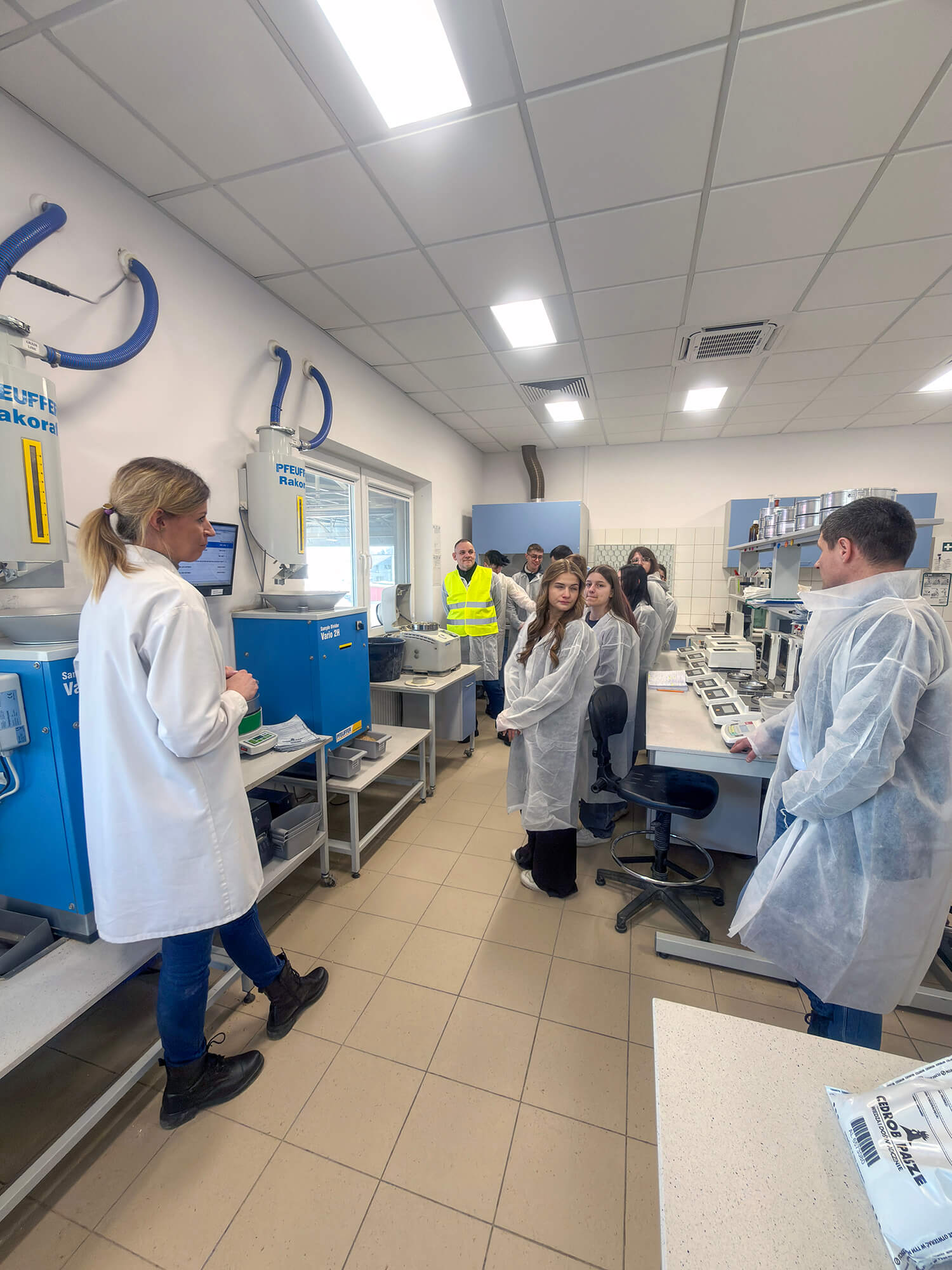 Ciekawym punktem programu wizyty było odwiedzenie laboratorium. Pani Iwona Żywocka, zastępca kierownika jednostki zaprezentowała specyfikę pracy swojego zespołu. Dzięki jej zaangażowaniu uczniowie krok po kroku prześledzili drogę surowca, który przyjeżdża do wytwórni – od momentu przyjęcia na wagach i szczegółowej analizy w laboratorium, aż po kontrolę gotowej mieszanki paszowej, przed jej wydaniem do klienta.